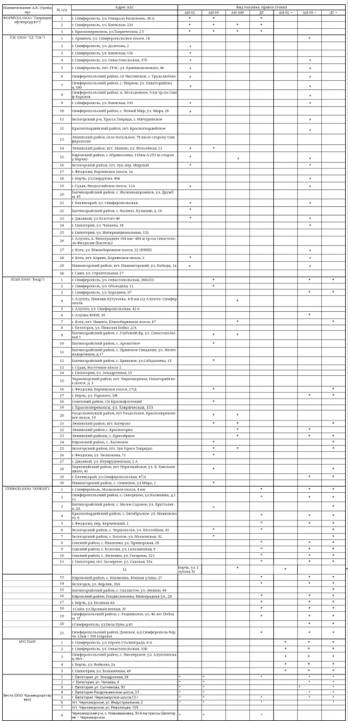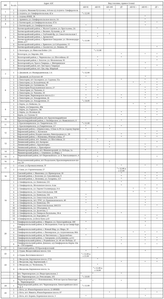 Топливо в наличии на АЗС Симферополя, Алушты, Бахчисарайского и Белогорского районов, Армянска, Евпатории, Джанкоя, Керчи, Красноперекопска, Красногвардейского и Ленинского районов, города Саки, Ялты, Феодосии и других городов и районов Крыма.