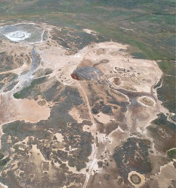 А холмики оказываются точь-в-точь настоящими вулканами, только в миниатюре. Высота конуса – около полутора метров, его вершину венчает крохотный кратер. Внезапно он начинает клокотать: газ, вырывающийся из недр, выталкивает, подобно лаве, холодную жидкую глину стального цвета. Она переливается через край и медленно стекает по склону. Зрелище завораживающее!