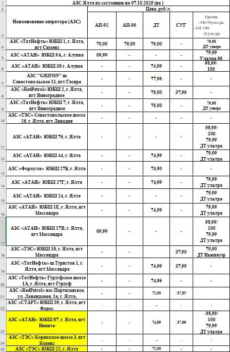 Актуальные данные о наличии топлива на АЗС Ялтинского ГО на 15:15, 7 октября. Данные взяты из Телеграм-канала главы администрации города, Янины Павленко.