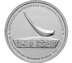 В центре монеты изображён памятник героям Эльтигена «Парус». Керченско-Эльтигенская десантная операция – совместная операция войск Северо-Кавказского фронта, Черноморского флота и Азовской военной флотилии, проводившаяся 31 октября – 11 декабря 1943 года. Она была необходима, чтобы завладеть Керченским полуостровом и создать там плацдарм для дальнейшего наступления советских войск.