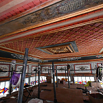 Потолки - подшивные, деревянные, наборные, с «сетчатым» рапортом из фигурных реечек. Их структура наследует старые традиции, хотя часть потолков была переделана в советский период. Около пятнадцати лет назад пытались воссоздать потолок по фотографиям Болдырева, но он оказался в неудовлетворительном состоянии - сейчас реставраторы укрепляют рейки и центральный плафон без демонтажа, прямо на подмостях.