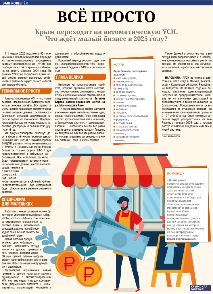 С 1 января 2025 года около 50 тысяч крымских предпринимателей перейдут на автоматизированную упрощённую систему налогообложения (АУСН), как сообщается в отчёте крымского Минфина за девять месяцев 2024 года. По данным УФНС по Республике Крым, новый режим отменит налоговую отчётность и автоматизирует расчёт налогов для малого бизнеса.