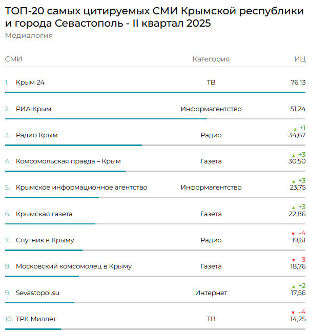 «Крымская газета» поднялась на шестое место рейтинга самых цитируемых СМИ Республики Крым и Севастополя за второй квартал 2025 года по версии «Медиалогии», поднявшись сразу на три позиции.