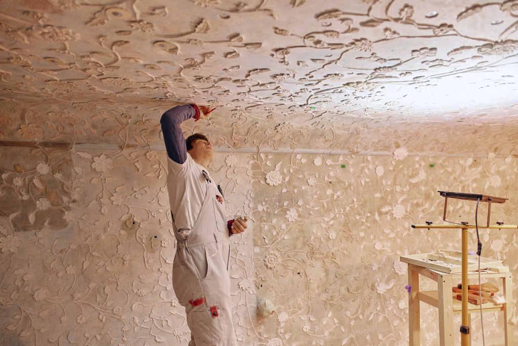 Работы финансируются из республиканского бюджета, выполняет их фирма, реставрировавшая Строгановский дворец. Начальник участка реставрации Дмитрий Сергеев показал процесс: всё зачищается – и стены, и лепнина. Местами элементы лепнины отвалились полностью, местами отклеились частично. Реставраторы размягчают лепные цветки, чтобы вернуть их на место прямыми. Вся гостиная – ручная работа. «Сроки назвать трудно, потому что за ручной реставрацией каждого элемента узора стоит колоссальная научная работа», – объясняет Сергеев.