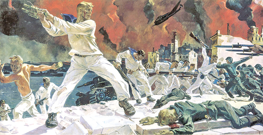 Исполнению замысла способствует колористическая гамма полотна. Кромешный ад, вселенский ужас символизируют огненные сполохи в небе, свинцовое море и мышиного цвета мундиры солдат вермахта. Но моряков, защитников Севастополя, художник изобразил в белых одеждах. Такой подход совершенно не соответствовал реалиям, но отвечал глубинной истине. Если это обычные матросские робы, то, согласно старинной традиции, именно для Черноморского флота их шили из отбелённой парусины. Если парадная форма, то она была полностью белой: и брюки, и рубаха-форменка, и бескозырка.