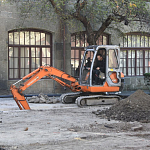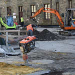 – Всё, что разрыли, раскопали, будем восстанавливать. Долго выбирался материал покрытия. Здесь вместо асфальта будет уложена специальная брусчатка – состаренный габбро-амфиболит из Карелии. Этот камень лучше всего вписался в цвет стен и исторический образ дворцового комплекса. Амфиболит очень плотный камень, его плотность свыше 3 200 кг/м³. Это даже больше, чем у бетона, – отмечает представитель подрядной организации.
