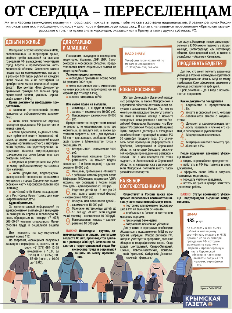 Жители Херсона вынужденно покинули и продолжают покидать город, чтобы не стать жертвами националистов. В разных регионах России им оказывают всю необходимую помощь – дают кров и финансовую поддержку. В связи с начавшимся переселением «Крымская газета» расскажет о том, что нужно знать херсонцам, оказавшимся в Крыму, а также других субъектах РФ.