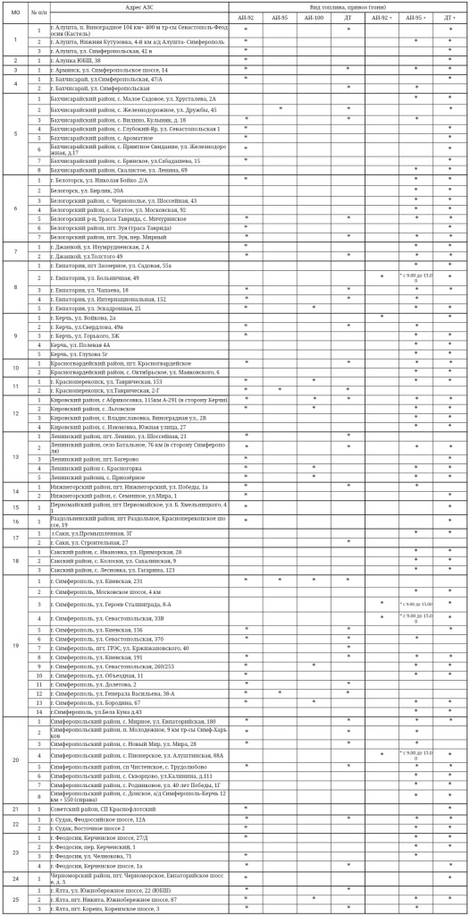 В списке предоставлена актуальная информация о наличии топлива на автозаправочных станциях Симферополя, Алушты, Бахчисарайского и Белогорского районов, Армянска, Евпатории, Джанкоя, Керчи, Красноперекопска, Красногвардейского и Ленинского районов, города Саки, Ялты, Феодосии и других городов и районов Крыма.