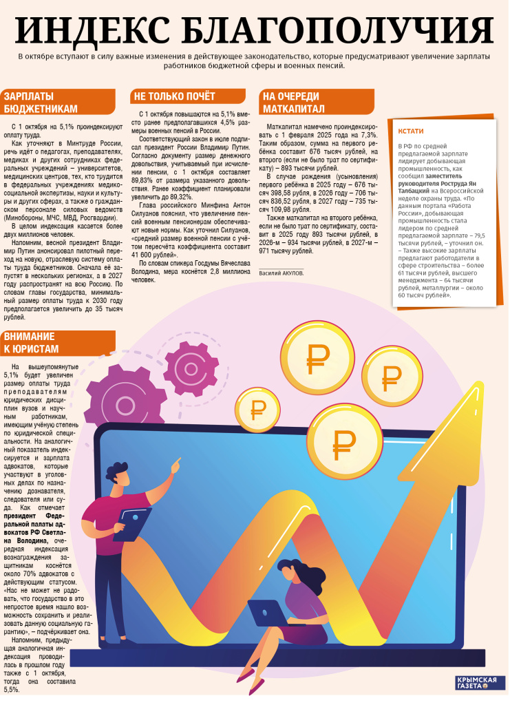 В целом индексация касается более двух миллионов человек. Напомним, весной президент Владимир Путин анонсировал пилотный переход на новую, отраслевую систему оплаты труда бюджетников. Сначала её запустят в нескольких регионах, а в 2027 году распространят на всю Россию. По словам главы государства, минимальный размер оплаты труда к 2030 году предполагается увеличить до 35 тысяч рублей.