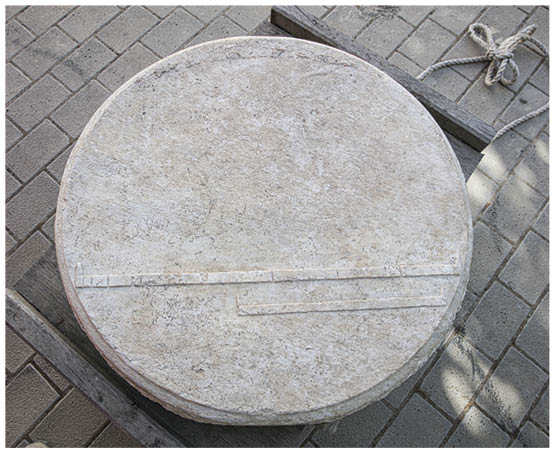 – Мраморная плита круглой формы залегала в грунте лицевой стороной вниз. Она сохранилась полностью и представляет собой столешницу (менсу) диаметром 65 см. Край плиты оформлен по периметру выкружкой. Лицевая поверхность покрыта мелкими насечками. Поверхность оказалась зашлифованной только в одном сегменте, на котором расположены рельефные изображения двух длинных прямоугольных полос, которые разделены поперечными линиями на отрезки. На концах полос размещены выступы-указатели. Изображения представляют собой линейки с указанием общей длины и пропорциональных частей, соответствующих длинам определённой метрической системы. Длина маленькой линейки 29,4 см, а большой, с разметкой – 55,6 см. Очевидно, стол с изображением мерной линейки являлся метрическим стандартом, установленным властями Херсонеса в качестве эталона. Стол мог находиться в небольшом помещении при храме или у входа на Агору, – рассказал кандидат исторических наук заведующий отделом «Городище и некрополь» Даниил Костромичёв.