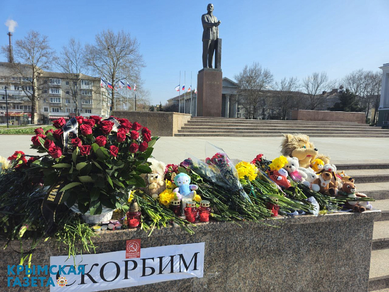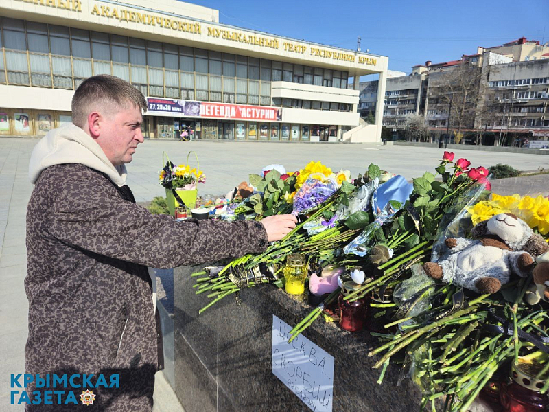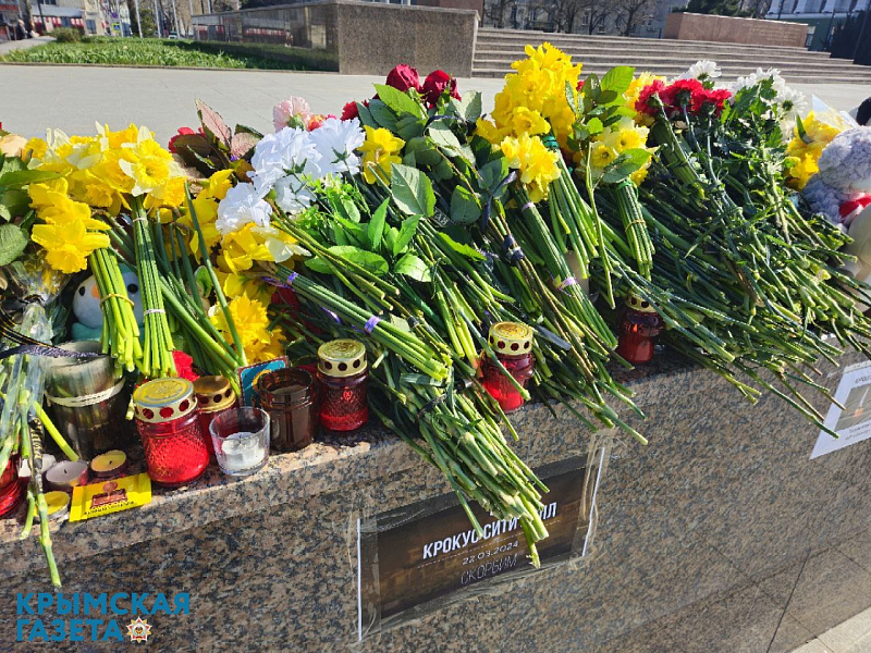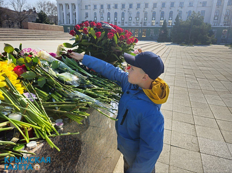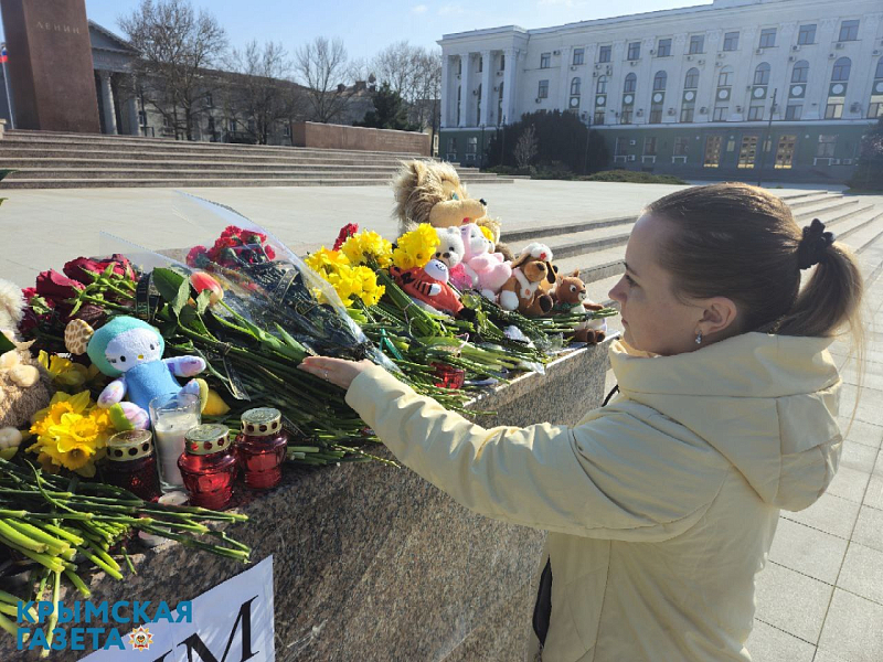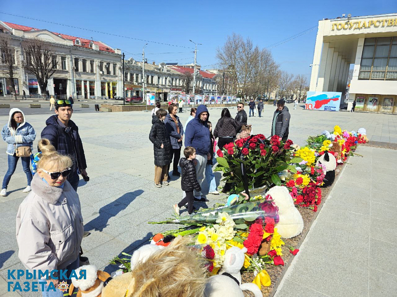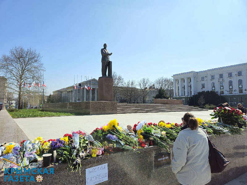 В память о погибших в «Крокус Сити Холле» жители Симферополя семьями возлагают цветы к стихийному мемориалу на площади Ленина.