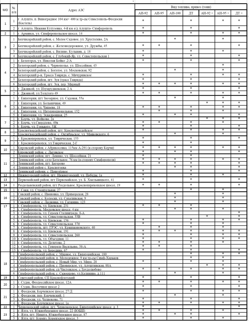 Актуальная информация о наличии топлива на автозаправочных станциях Симферополя, Алушты, Бахчисарайского и Белогорского районов, Армянска, Евпатории, Джанкоя, Керчи, Красноперекопска,