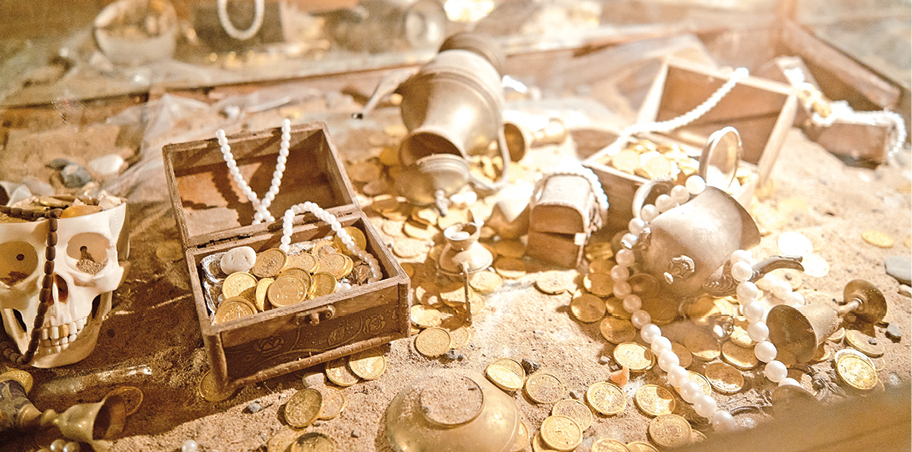 В музее представлена коллекция старинных монет и драгоценностей, которые ассоциируются с пиратскими захватами. Это золотые дублоны, серебряные пиастры и различные украшения.