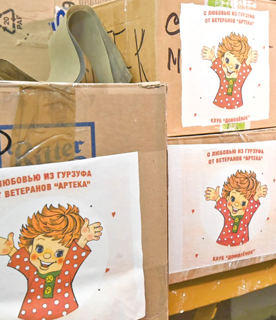 Особая гордость гурзуфских мастериц – их фирменный знак. Женщины в качестве своего логотипа используют домовёнка Кузю. Его изображение они клеят на каждую коробку, куда ещё обязательно кладут связанные ими же нос-ки, а также сладости. Каждая посылка отправляется с особой надписью: «С любовью из Гурзуфа от ветеранов Артека». Это не просто слова – это выражение искренней заботы о тех, кто сейчас защищает нашу Родину.