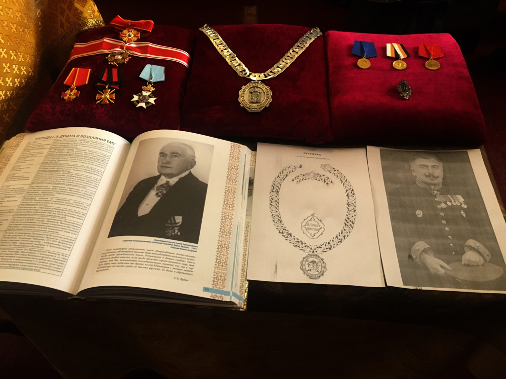 Так, среди высоких российских наград градоначальника - Орден святого Станислава II степени, который виден на полупарадном портрете Дувана, сделанном в Париже в 1943 году, Орден святой Анны III степени, пожалованный по Высочайшему приказу за заслуги по устройству Таврического лазарета во время Русско-японской войны 1904-1905 годов, Орден святой Анны II степени («в воздаяние особых трудов и заслуг, оказанных Императорскому русскому театральному обществу») и Орден святого Владимира IV степени («за труды по отличному выполнению всеобщей мобилизации 1914 года»). В 1911 году греческий король Георг Первый пожаловал Дувану Серебряный крест Греческого Королевства «за личные деяния, связанные со строительством в Евпатории греческой церкви» (речь о том самом Свято-Ильинском храме, где и прошла экспресс-выставка).