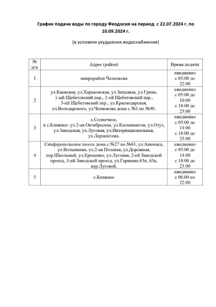 В Феодосии воду будут давать по графику .Об этом сообщили в Феодосийском филиале ГУП РК «Вода Крыма». Из-за аварийного состояния участка магистрального Челноковского водовода и повышенным водоразбором потребителями предприятие не имеет технической возможности обеспечить заполнение резервуаров запаса питьевой воды.