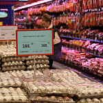 При нас пенсионерка Татьяна Ивановна берёт с полки десяток яиц по соццене 96 рублей и рассказывает, что предпочитает именно товары с синими ценниками, ведь нередко они дешевле других, а качеством не уступают.