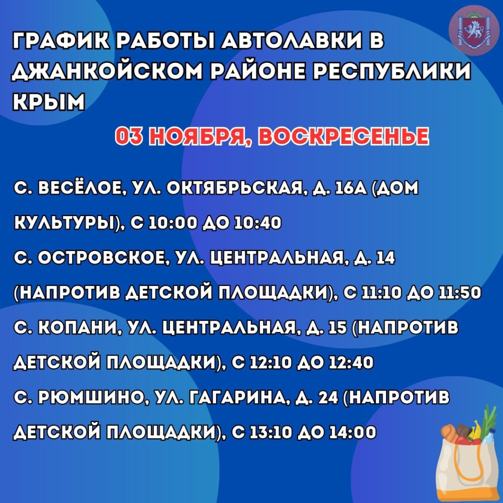 В это воскресенье, 3 ноября, жители Джанкойского района смогут приобрести продовольственные товары в автолавках. Об этом сообщили в пресс-службе Министерства промышленной политики Крыма.
